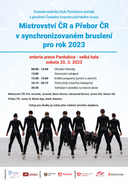 V sobotu dne 25.2.2023 se uskuteční Mistrovství ČR a Přebor ČR v synchronizovaném bruslení. Závody se uskuteční ve velké hale enteria areny Pardubice.