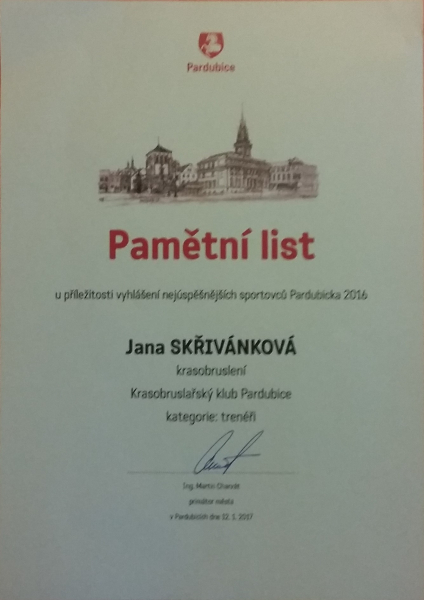 Další ročník ankety o Nejúspěšnější sportovce Pardubicka 2016 již zná své vítěze. Oceněno bylo celkem 20 jednotlivců, šest družstev a ceny si odneslo také šest trenérů. Nových členů se dočkala i takzvaná Síň slávy pardubického sportu, do které přibyli vynikající hokejový hráč a trenér Zdeněk Uher a trenér Luboš Bulušek, který se podílel na jediném titulu pardubických basketbalistů v historii. Slavnostního večera se zúčastnili také náměstci primátora Jakub Rychtecký s Jiřím Rozinkem a dorazila i náměstkyně ministryně školství pro sport Simona Kratochvílová. Mezi oceněné trenéry se zařadila také naše trenérka Jana Skřivánková.