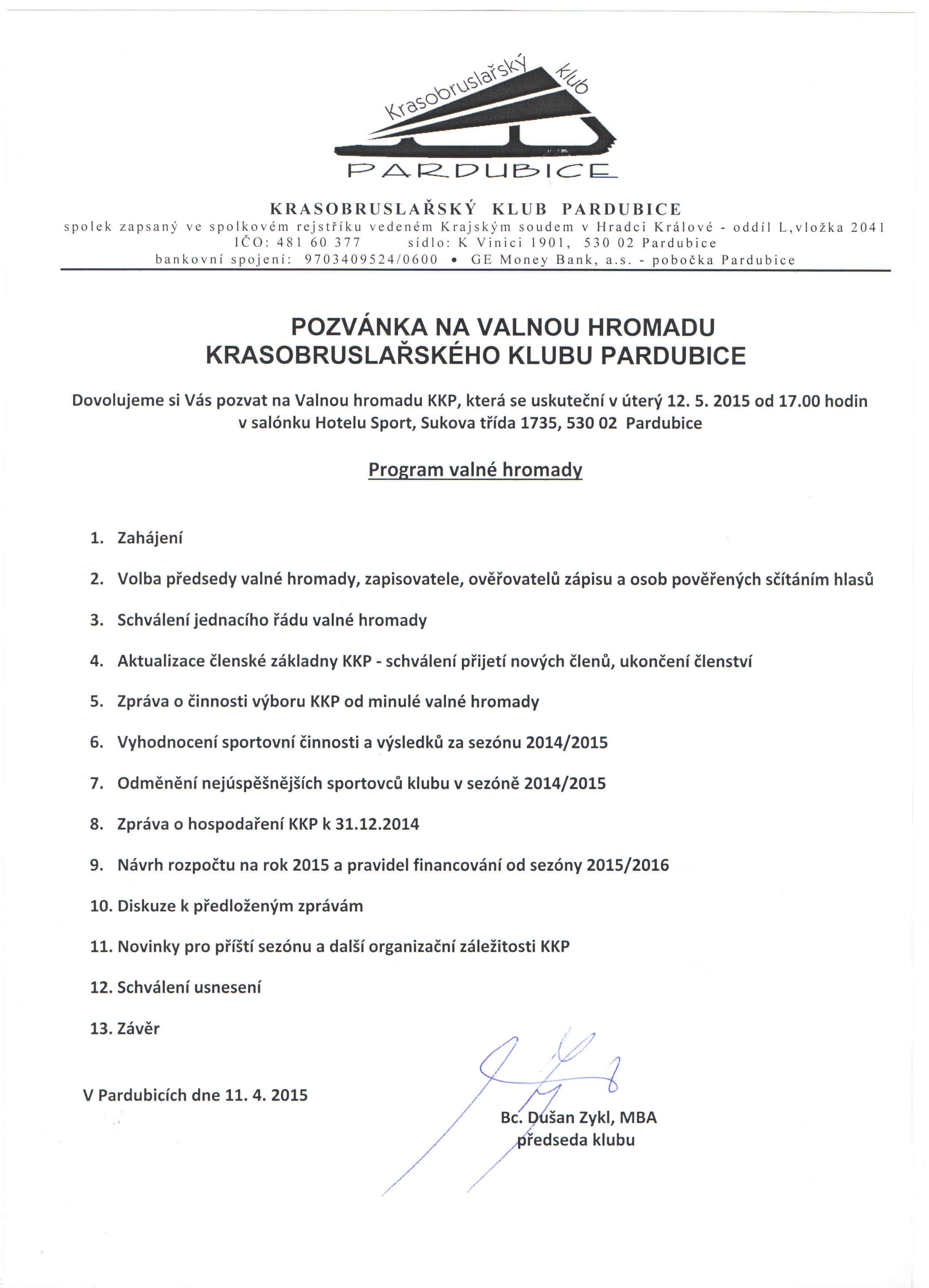 Jednou z povinností výboru KKP je svolání valné hromady členů KKP jako nejvyššího orgánu spolku zákonem stanovenných povinností je svolání valné hromady. Krasobruslařský klub Pardubice svolává na úterý 12. května 2015 od 17.00 hodin řádnou valnou hromadu, která se uskuteční v salónku Hotelu Sport, Sukova třída 1735, Pardubice 530 02. V salónku jsou očekávány závodnice starší 15 let, které mají hlasovací právo, ale také ostatní členové a členky KKP oddílu.