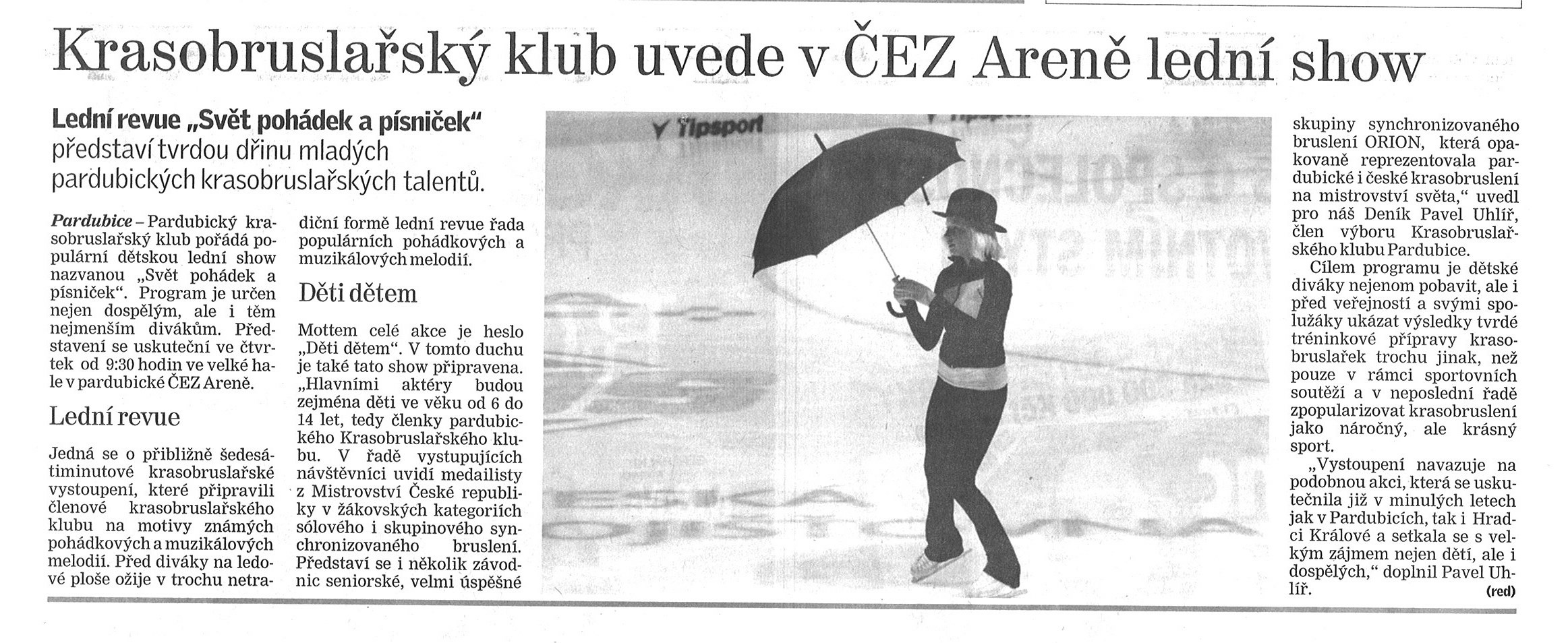 Pro naši lední revue Svět pohádek a písniček se nám podařilo získat velmi silného mediálního partnera, kterým je DENÍK. Ve spolupráci s regionální redakcí Pardubického deníku se mohli občané Pardubic a okolí dočíst o této, pro pardubický krasobruslařský klub významné akci, o lední revue Svět pohádek a písniček.