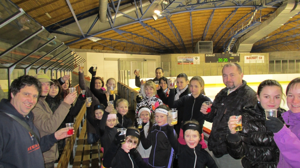 Ale nebyl by to předposlední den v roce a poslední trénink v roce 2011, abychom to s našimi závodnicemi, trenéry a přítomnými rodiči náležitě neoslavili. Do vzduchu létaly špunty a nad ledovou plochou bylo cítit "bublinky".