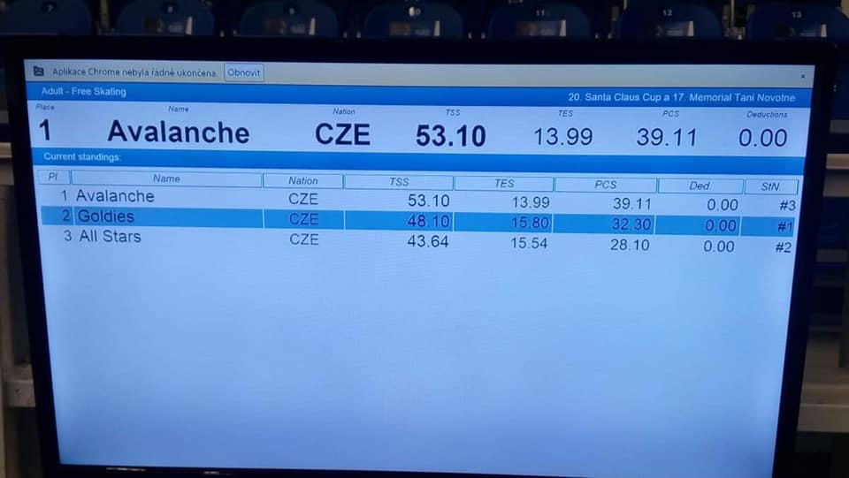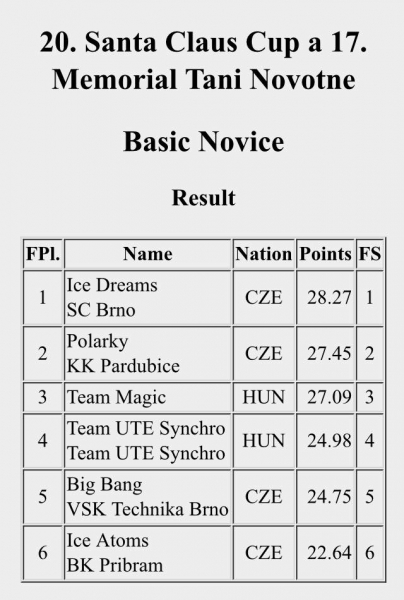 V Brně dne 15.12.2018 konal 20. ROČNÍK VÁNOČNÍHO ZÁVODU SKUPIN SYNCHRONIZOVANÉHO BRUSLENÍ SANTA CLAUS CUP 2018 a 17.ročník Memoriálu Tani Novotné.