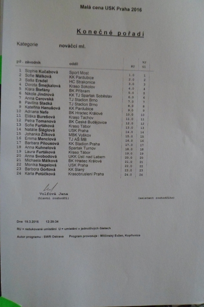 Pardubické krasobruslařky se zúčastnily posledního závodu letošní sezóny. Dne 19.3.2016 se konala Malá cena USK Praha. Závodu se zúčastnilo celkem 6 děvčat našeho oddílu. Nejlépe si vedly Sofinka Málková a Janička Kremlová, které se obě probojovaly na stupně vítězů. Sofinka vybojovala stříbrnou medaili v kategorii nováčci mladší-dívky a Janička medaili bronzovou v kategorii nováčci dívky.